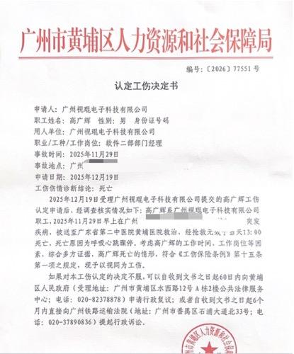 新京报讯(记者 秦冰 实习生 王熙媛)此前备受关注的广州一名32岁程序员在家加班时猝死的案件又有了新的转机。 3月13日,新京报记者从死者高光辉的妻子处获悉,高光辉的死亡属于工伤。工业事故的确定。图片来源:受访者:高光辉女士,32岁,曾在广州世坤电子科技有限公司担任软件开发工作,担任部门经理。2025年11月29日星期六,高光辉在家工作时晕倒,被送往医院后死亡。当天上午10点48分进行急救后,Ko Kouki被编入新的工作组。死亡消息公布八小时后,我们仍在收到工作信息。高光辉的手机浏览记录显示,当天他五次登录公司OA系统。氧在突然去世前一周的一个工作日,Ko Hiroshi 早在晚上 9 点 38 分就回到了家。晚上 10 点 47 分,他最后一次回家是在晚上 10 点 47 分。米。病历显示,Ko Kouki的死因是呼吸骤停和心脏骤停,疑似患有阿斯彭综合症,一种心源性脑缺血综合症。高光辉的妻子认为丈夫因工作中突发疾病去世,于2025年12月19日申请工伤赔偿。柯光辉所在单位此前回应称,已向相关部门提交相关材料,正在配合调查。 Kouki Takaaki 生前的照片。受访者供图 3月13日晚,高光辉的妻子光辉告诉新京报记者,高光辉已被认定为工伤。根据广州市黄埔区人事和社会保障局出具的《工伤认定决定书》,她向本人提供了《工伤认定决定书》。新京报记者表示:“考虑到高光辉先生的工作时间、职务等,综合结合多方证据,高光辉先生的死亡情况符合工伤保险条例第十五条第一款的规定,目前认定为工伤。”工伤。 ” 编辑杨海,校对:翟永军