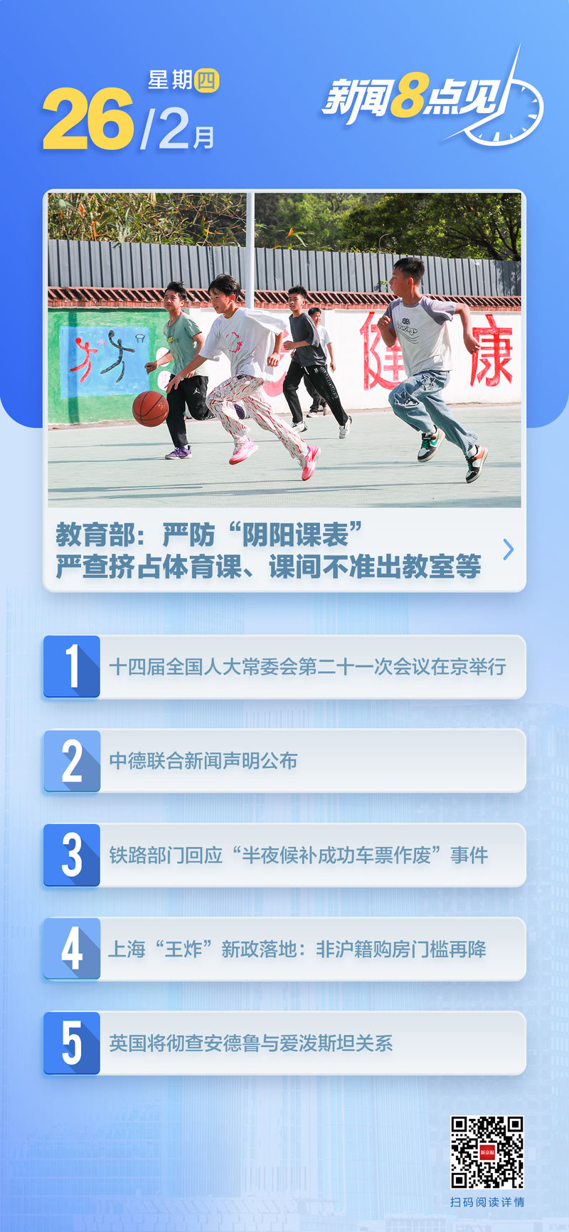 【时事新闻】第十四届全国人民代表大会常务委员会第二十一次会议在北京举行。第十四届全国人民代表大会常务委员会第二十一次会议25日下午在北京人民大会堂举行第一次全体会议。 (新华社)阅读全文>>>教育部:严查占用体育课、课间不让学生离开教室等行为。记者2月25日从教育部获悉,教育部将全面实施2026年学生体质健身计划,以促进学生健康为重点,严禁“阴阳时间表”,严厉查处占用体育课、阻止学生课间离开教室等行为。 (新华社)阅读全文>>>中国激活手表意味着什么?第一次使用系统吗? 2026年2月24日,日本商务部公布2026年第11号和第12号公告,依法分别将40家日本企业列入出口管制名单和观察名单,同时出台了具体的出口管制措施。这是针对商务部今年1月宣布加强对日两用货物出口管制而采取的新举措。 (探店钰源)阅读全文>>>国家消防救援人员法草案明确了录用和拒绝制度。国家消防救援人员法草案于2月25日首次提请全国人大常委会审议。草案共7章47条,包括规范国家消防救援人员管理、明确征聘和退休制度、保障国家消防救援人员合法权益等措施。救援人员,明确资金保障和工资。 (新华社)福建海警局已依法在金门附近海域启动常态化执法巡逻。中国海警东海支队新闻发言人朱安庆表示,2月25日,福建海警在金门附近海域依法启动例行执法巡逻。 2月份以来,福建海警组织船队持续加强金门周边海域警务巡查,进一步强化相关海域管控,切实维护包括台湾在内的中国渔民合法权益和生命财产安全,有效保障厦门金门海域正常航行和作业秩序。 (中国海警办公室)中华人民共和国和德意志联邦共和国联合新闻稿我们有兴趣深化各领域合作,通过坦诚、开放、相互尊重的对话妥善解决分歧。 (新华社)阅读全文>>>外交部回应称,对日本自民党近期放宽武器出口限制的举动“严重关切”。 2月25日,外交部发言人毛宁在例行记者会上,就自民党近期放宽武器出口限制的举措发表谈话。我们关注有关报道,对此十分关注。 (新华社)阅读全文>>> 【本地】今年唯一一次月全食将在元宵节晚上发生,北京也将看到月全食。今年的元宵节将于3月3日举行,全年唯一一次月全食将在当天下午发生。在那时,夜空中将会出现一轮“红月亮”。北京天文馆专家宣布,第一次月食发生在3月3日至17日。49小时后,月亮将仅在东北方的地平线上可见。 18时22分,半月将出现月食,此时包括北京在内的东部地区将开始月食和月出。 (北京报)阅读全文>>> 【社会】铁路局回应旅客举报称:“夜间候车的1700元车票已作废”。记者从12306铁路技术中心获悉,近期接到“12306夜间候车1700元车票作废”的举报后,该中心迅速组织核查行动。 (新京报)阅读全文>>> 【财经】上海新“网闸”政策已实施,降低居民非上海居民购房门槛再次房子。 2月25日,上海市住房城乡建设管理委员会、市住房局、市财政局、市税务局、市公积金管理中心联合公布了《关于进一步优化调整房地产政策的通知》,其中包括减少限购政策、优化准备金等七项内容(以下简称“七新条”)。完善融资政策和房产税政策。自2026年2月26日起施行。“七新条”最明显的变化是限购政策的调整。公告称,对本市以外家庭(含单身成年人,下同)购买外环以内住房的,社保缴费期限调整为一年。此次调整后,购房上海以外地区家庭缴纳一年社保的范围从外环线以外扩大到全市。 (新京报)阅读全文>>> 【体育】华策影视否认“解散电影事业部”:电影业务将全面现代化,不再盲目追求规模化。2月25日,华策影视发布声明称,近期网络上流传“华策影视将解散电影事业部”的不实谣言,相关信息没有事实依据,对公司品牌造成负面影响华策影视表示,正在全面推进“内容+技术”战略升级,以人工智能技术作为内容生产创新的核心驱动力,改造提升包括电影巴士在内的所有内容领域。状态。 2026年电影业务将得到严重强化,不再一味追求规模,而是聚焦于盈利“收支平衡”,优先恢复现金流。 (界面新闻)WTT新加坡大满贯:孙颖莎等国内乒乓球选手晋级16强。世界职业乒乓球联赛(WTT)新加坡大满贯25日继续进行。剩下的16强名额将通过男单和女单决出。中国队的孙颖莎、石洵耀、王艺迪、蒯曼、陈媛雨、向鹏晋级。 (新华社)阅读全文>>>【国际】俄罗斯和乌克兰代表将于26日在日内瓦与美国分别举行会谈。据俄罗斯和乌克兰25日发布的消息,俄罗斯和乌克兰代表将于26日在瑞士日内瓦与美国代表举行双边会谈。 (新华社)阅读全文>>> 美国公布了与伊朗相关的新制裁清单。当地时间2月25日,美国财政部外国资产控制办公室(OFAC)更新了“特别指定国民名单”,将多名个人以及与伊朗有联系的个人纳入其中。该公司及多艘船舶受到相关制裁。 (央视新闻) 英国将全面调查安德鲁先生和爱泼斯坦先生之间的关系。当地时间2月24日,英国政府宣布任命英国前王子、国王查理三世弟弟安德鲁·蒙巴顿-温莎为贸易特使,对他与爱泼斯坦的关系进行彻底调查。他同意从此公开自己的工作文件。英国此前有消息透露,安德鲁涉嫌在担任贸易特使期间向爱泼斯坦提供机密文件。 (央视新闻)阅读全文 >>> The d Team 与韩国特别督察行动抗议被指控为内战领导人的尹熙容的一审判决。据韩国媒体报道,25日,韩国特检组对被指控为内战领导人的被告人尹熙容一审判决提出抗议