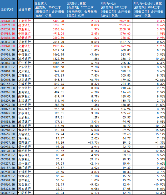 上市银行第三季度报告已于十月下旬完成。总体来看,42家A股银行的利润有所改善:超过80%的银行今年一季度实现归属于母公司净利润同比增长,而只有7家银行实现归属于母公司净利润同比增长。但受债券市场波动影响,多家上市银行非利息净收入有所下降。盘古智库首席研究员于丰辉指出,今年1-3月上市银行净利润增长主要得益于净利息收入稳定增长和资产质量改善。尽管非利息收入面临压力,但银行通过优化资产负债结构,特别是贷款定价和成本管理能力,有效杠杆了整体盈利能力。此外,随着经济逐步随着经济复苏,信贷需求的复苏也为银行盈利提供有力支撑。六大银行前三季度净利润合计突破1万亿元,部分城乡商业银行净利润增速位居前列。券报数据显示,42家A股上市银行中,超过80%的银行归属于母公司净利润同比增长,仅有7家银行归属于母公司净利润同比增长。其中,部分城市商业银行和地方商业银行的增速占据显着位置。青岛银行、齐鲁银行归属母公司净利润同比增长超过15%。杭州银行、江阴银行、常熟银行、重庆银行涨幅均超过10%。归属于母公司净利润下降的7家银行中,一半以上是股份制银行。华夏银行、平安An银行、光大银行、浙商银行销售额和归母净利润均下降,民生银行销售额增长但利润不升。从收入来看,工商银行以6400.28亿元排名第一,比上年增长2.17%,其次是建设银行、农业银行和中国银行。今年前三季度,四大国有银行的销售额和归属于母公司的净利润均实现了翻倍增长。归属于工商银行、建设银行、农业银行、中国银行母公司的净利润分别增长0.33%、0.62%、3.03%和1.08%。新京报贝壳财经记者根据Wind数据绘制了42家A股上市银行三季度业绩图表。今年1-3月主要银行六家银行销售额和归属母公司净利润双倍增长,突破万亿大关,总销售额达2.72万亿元,归属母公司净利润达1.7万亿元。股份制银行中,招商银行、兴业银行、平安银行、光大银行、华夏银行和浙商银行今年前三季度收入均出现下滑,降幅分别为0.51%、1.82%、9.78%、7.94%、8.79%和6.78%。上述银行中,除招商银行利息净收入同比小幅增长1.74%外,其他银行利息净收入均出现不同程度下降。相比之下,部分城市商业银行则实现了净利息收入的大幅增长。今年前三季度,西安银行利息净收入同比增长超过60%,达到63.1亿元,占比超过80%。南京银行利息净收入同比增长年初同比增长30%至252.07亿元,占比超过60%。江苏银行、齐鲁银行、重庆银行的净利息收入增速也分别达到19.61%、17.31%和15.22%。没有。不过,部分银行的利差也同比下降。贵阳银行和首都银行前三季度利息净收入同比分别下降12.29%和17.34%。债券市场的波动影响非利息收入。许多银行的公允价值变动净利润转为亏损。非利息净收入也是影响上市银行利润的因素之一,但债券市场的波动增加了非利息收入的不确定性。前三季度,招商银行、光大银行、华夏银行、建设银行、上海银行分别录得净亏损88.27亿元、49.82亿元、45.5亿元、41.16亿元,环比变动公允价值32.65亿元,较上年同期全部超盈转亏。财报显示,招行2025年一季度至三季度实现非利息净利润913.78亿元(同比下降4.23%),占营业利润的36.34%。非利息净收入中,手续费及佣金净收入562.02亿元,同比增长0.90%。其他净利润351.76亿元,同比下降11.42%,主要是固定收益和基金投资收入下降。由于A股42家上市银行公允价值变动,新京报记者贝壳财经根据风能数据绘制了盈利图表。三季度末,招行其他综合收益261.79亿元,比上年末下降39.48%。招商银行表示,这主要是为了由于分类为公允价值计量的投资的公允价值下降,其变动计入其他综合收益。华夏银行前三季度公允价值变动收益为-45.5亿元(去年同期为33.26亿元),同比减少约78亿元。 10月24日,华夏银行行长曲刚在公司2025年第三季度业绩发布会上表示,2025年一季度收入下降的主要原因是债券市场波动导致公允价值变动收益同比下降。平安银行在三季报中也指出,“虽然受信贷利率下降和业务结构调整的影响,但受市场波动影响,除投资利息等以外的净利润有所下降。”国海证券在研报中也提到,江苏银行债券投资较去年有所增长。rge。债券市场异常波动可能对资产估值和资本充足率产生负面影响。目前债券投资余额202.32亿元,波动风险不容忽视。于丰辉指出,银行平衡短期利润和长期风险很重要。银行因债券市场波动而面临公允价值波动损失,需要加强风险管理,增加投资组合的多样性,降低风险对单一市场或产品的依赖。同时,建立更加灵活的投资策略,根据市场环境及时调整自己的资产配置,避免过度承受市场波动的影响。从长远来看,需要加强内部风险管理体系建设,提高应对市场变化的能力。净息差较上年末持续收窄一些银行已逐季复苏。从净息差来看,上市银行整体净息差较上年末仍有收缩,但二季度末以来部分银行净息差有所恢复。除民生银行、西安银行、光大银行、郑州银行外,42家上市银行净息差较上半年末有所回升。一季度末,西安银行净息差1.79%,较上年末上升0.43个百分点,较二季度末上升0.09个百分点。光大银行净息差为2.03%,较上年末上升0.49个百分点,较二季度末上升0.63个百分点。二季度不少城市商业银行净息差有所恢复。一季度末,贵阳银行净息差1.57%,较上年末下降-0.18%d 较上年末增长 0.04%,但较二季度末增长 0.04%。兰州银行