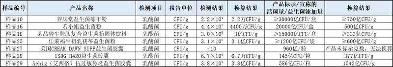 许多益生菌产品所宣传的数千亿甚至数万亿的“活细菌”真的是真的吗?近年来,益生菌已成为健康摄入的“新必需品”。市场规模快速扩张的背后,是一些产品的炒作、质量参差不齐等混乱。 2025年10月底至今年3月,北京报业消费者研究所从各平台随机抽取30款益生菌产品,委托第三方专业检测机构检测活菌量,并获得经CMA认证的检测报告。检测结果显示,7款益生菌产品的活菌数量远低于产品标签上的数值。其中,一款声称每克添加 750 亿个 CFU 活菌的益生菌产品实际上每克只添加了 22,000 个活菌。一种产品声称每克添加 750 亿个活细菌,而实际读数为 22,000 个。根据联合国粮食及农业组织和世界卫生组织联合专家委员会对益生菌的科学定义,益生菌是指在摄入足够量时对宿主健康有益的活微生物。益生菌是对人体健康有益的细菌的总称,而不仅仅是一种或几种细菌。目前市场上的益生菌产品数不胜数,但名义菌株的概念过于专业化,消费者难以理解且难以区分。于是,消费者现在有了一个更直观的卖点:活菌数量。 “只有到达肠道并定植并发挥一定作用的活细菌菌株才能发挥益生菌作用。虽然一些免疫调节研究表明死细菌(灭活细菌)也有一定的健康价值,但大多数消费者的看法是,麻木的细菌“活菌含量是衡量产品有效性的重要标准。”中华医学会营销工作委员会秘书长王代红解释道。近日,新京报消费者研究所跨平台随机抽取了30款益生菌产品,针对国产、进口、跨境品牌。按产品类别分,保健食品1款、运动营养食品(营养补充品)1款、固体和速溶饮料10款,其中标注乳酸菌粉的案例有5例,其他食品也有标注的案例未标注进口或跨境采购产品6起。剂型方面,益生菌粉剂25款,胶囊4款,咀嚼片1款。2025年11月,30款产品送第三方检测机构进行分析,按照现行规定检测活菌含量。t国家标准GB 4789.35-2023《食品安全国家标准食品微生物检验乳酸菌检验》。本标准中的乳酸菌主要包括乳酸菌、双歧杆菌和嗜热菌。检测结果显示,7款益生菌产品检出的活菌值远低于标签或宣称值。样品编号为样品10、样品16、样品18、样品25、样品27、样品28、样品29,分别对应养清堂益生菌产品、若小姐、部分品牌牛脾肽复合益生菌粉、Carlive、美国CREAK DAWN SUPP、ISDG、Aehig。这些产品的活性数量不到已发布数量的 1%。注:该信息由北京报社记者根据实验结果整理。其中,样品10益生菌冻干粉的活细胞计数测试结果为22,000 CFU/g。受影响产品已提交检验样本为养生堂益生菌冻干粉(2024年10月23日生产)。包装上显示,每盒在制造过程中添加的活菌数量超过 300 亿 CFU,换算成超过 750 亿 CFU/g。对益生菌粉末样品 16 进行分析以确定活菌计数为 4400 万 CFU/g。送检的受影响产品为罗米斯益生菌粉(2024年5月6日生产)。包装上注明,生产过程中添加的活菌量为2000亿CFU/盒,换算成500亿CFU/g。样品18复合益生菌粉固体饮料活菌含量检测结果为3亿CFU/g。相关测试介绍为某品牌含牛脾肽的粉状益生菌固体饮料(2、2025年4月8日生产)。包装上标明每盒添加了超过 15 亿 CFU 益生菌,即约 333 亿 CFU/每克添加g。牛初乳和茯苓益生菌粉样品 25 的分析结果为 3.1 亿 CFU/g。提交测试的受影响产品是Carlive Bovine Cabbageostrum和Polia Probiotics Powder(2025年3月3日生产)。包装上注明每袋添加超过 1200 亿 CFU 的活性益生菌,相当于超过 600 亿 CFU/g。 28 粒益生菌胶囊样本的活菌计数为 67,000 CFU/g。受影响的送检产品为跨境采购产品ISDG B420益生菌胶囊(有效期2026年9月5日)。包装上注明,活乳酸菌的添加量为145亿CFU/胶囊,换算下来约为377亿CFU/g。 29 粒益生菌胶囊样本的活菌计数为 3.8 亿 CFU/g。提交测试的受影响产品为Aehig抗过敏性鼻炎益生菌胶囊(有效期2026年12月17日),是从Cross购买的产品s-border.zo。该产品标有活菌计数为 586 亿 CFU/胶囊,或约 1542 亿 CFU/g。 27颗益生菌胶囊样品活菌计数检测结果<10 CFU/g,对应送检产品为美国CREAK DAWN SUPP益生菌胶囊(2025年8月5日生产),为跨境代购产品。内容物粘在胶囊壳上,即使在所有样品制备后也无法检测到。此外,新京报记者购买的该产品包装上写着:“该产品添加了18种益生菌,每粒胶囊含有960亿CFU活菌,但卖家的图文宣传称1粒胶囊每天690亿CFU。”当北京报记者向客服询问此事时,客服发来了产品的翻译图片,并强调会优先翻译图片。然而,有产品照片和翻译之间也存在差异。左边产品照片上的英文标签是“Each pig contains 960亿(960亿)CFU”,但右边的翻译是690亿CFU。对此,客服无法做出解释。对于7款产品的检测结果,王大洪先生表示,产品标签值/宣称值与实际检测值存在较大差异,可能有多种原因,除非实际添加,否则益生菌产品中的活菌量与制造工艺和储存条件,如水分活度、温度等直接相关,影响很大。15款产品的实际值略低。活菌检测值高于或接近标签值的产品,约占76.67%。其中,8款益生菌产品活菌检测值均高于标签值,且相关品牌有万依兰、Vuka Laboratory、Oriental Selection、Notland、汤臣倍健yes、江中利活君恒信、乐利、Childlife。其中,江中利活君恒信牌益生菌粉是其中唯一的健康食品。 30个产品,也是检测值高于标签值最多的产品。瑞意、合生元、心怡、妈咪、舒伯特、露娜、聚夏阿宝、贝雷健、康恩贝、仁和、努联、湘雅康尔福、一莲清盈、金搭档、浙华药业共15种益生菌的活菌检测值均低于标注值,但差异较小。对